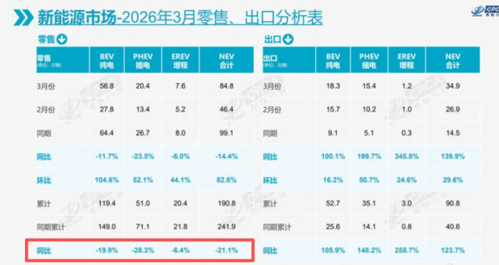 凭证乘联会统计,2026年第一季度,国内新能源乘用车零卖量为190.8万辆,同比昨年下滑了21.1%,这一数据高于举座乘用车阛阓17.4%的下滑幅度。
