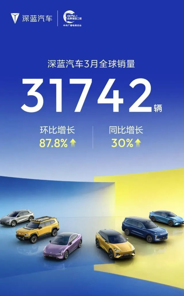 本年3月,深蓝以全球总销量31742辆的收获,已毕了同比增长30%,环比增长87.8%。