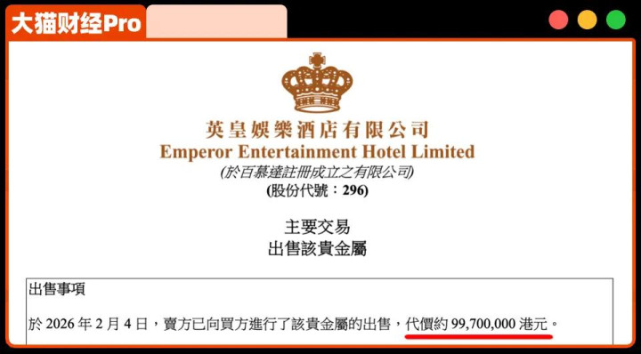 英皇娱乐酒店发公告说,这78公斤的黄金,卖给了德国的贺利氏,套现9970万港元。