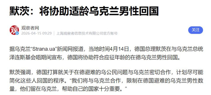 4月14日,德国总理默茨在与乌克兰总统泽连斯基会晤时期通知,德国将协助相宜应征年岁的在德乌克兰男性归国。