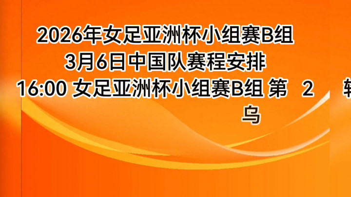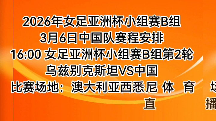 小组赛B组,3月6日中国队赛程安排。16:00女足亚洲杯小组赛B组第2轮,乌兹别克斯坦VS中国。比赛时局:澳大利亚西悉尼畅通场。直播平台:CCTV5(电视端)。