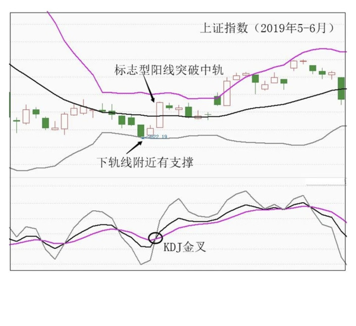 上证指数2019年5-6月的走势就是典型:5月11日以一根标志型大阳线突破布林线中轨,同时KDJ当日发出金叉信号,而且在此之前,指数已经在下轨附近得到支撑,中轨线也走平,这就是一个高可靠性的买点,后续指数开启了一波反弹。