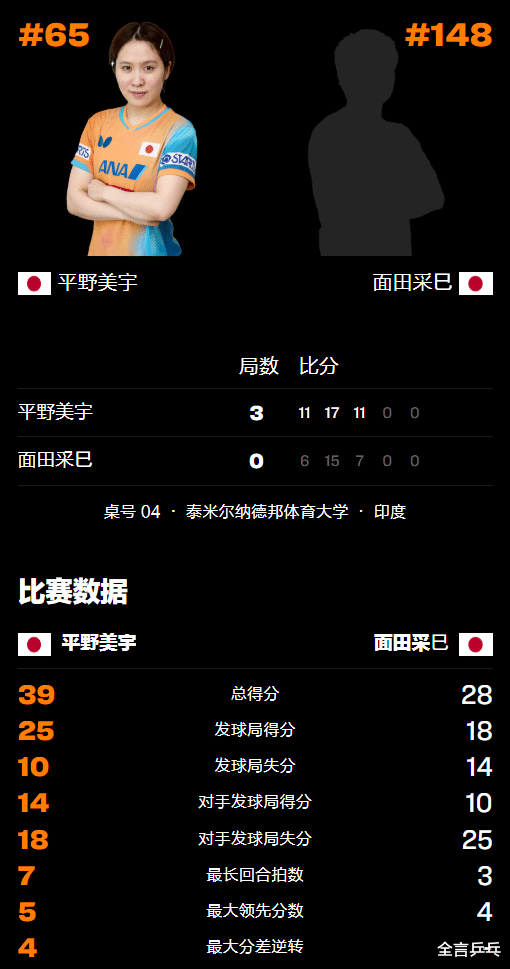 2026年2月13日,乒乓球WTT印度金奈球星赛爆发日本女单内战,宇宙冠军、亚洲冠军平野好意思宇天然大比分3-0横扫队友面田采巳,但后两局齐出现逾期反击、最终战至关键分险胜的情况,险胜晋级16强并不松驰,贯注战况请看下文。