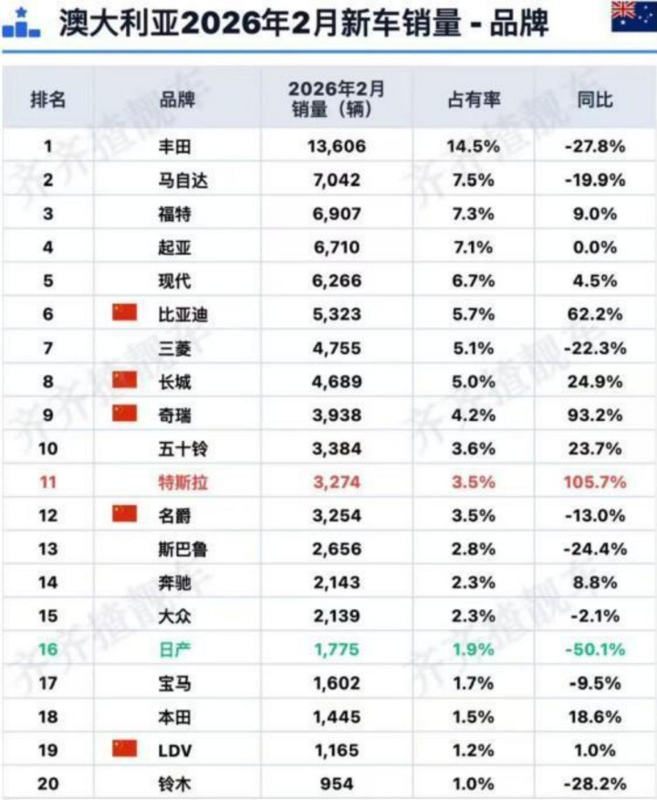把柄澳大利亚汽车工业商会(FCAI)发布的数据,2026年2月,源自中国的汽车在澳洲销量达到22362辆,以691辆的隐微上风初度超越日本(21671辆),松懈了日本长达28年的把握地位。