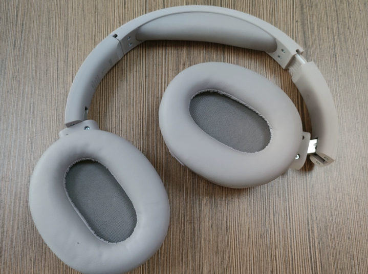 佩戴舒铁心:240g整机分量,收受无褶皱卵白皮耳罩+柔嫩减压头梁+玻璃纤维增强结构,耳罩柔嫩亲肤,夹抓力适中,商务场景佩戴质感拉满,但适配性有一定局限。